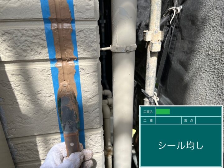 打設したシーリング材を、専用のヘラで抑えました。余分なシーリング材を除去し、表面をきれいに整えたり、密着させたりすることを目的に施工しました。