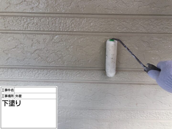 下地処理後、中塗り塗料、上塗り塗料の密着性を高めるために、下塗りを行いました。