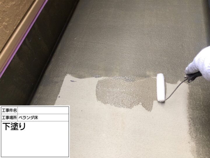 下塗り前にカチオンを塗ることで、下地調整を行いました。膨れや剥がれの防止につながる工程です。