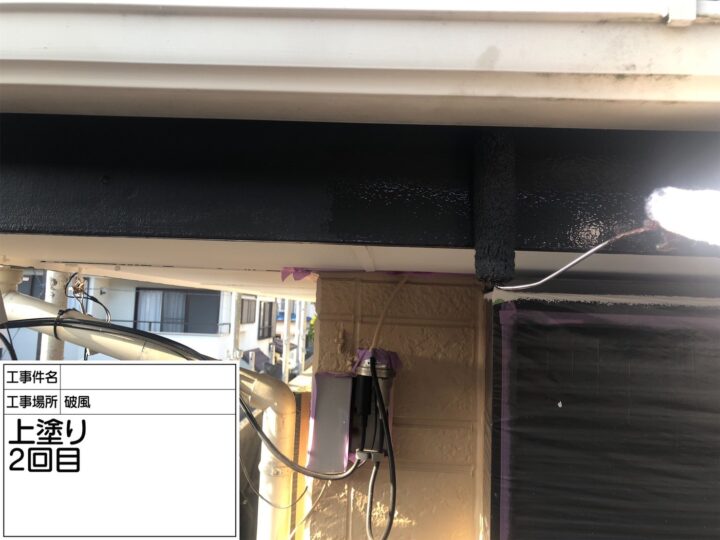 窯業系サイディングで出来た破風板・鼻隠しは、下地処理し、プライマーを塗り、上塗りを2回全体へ塗装しました。