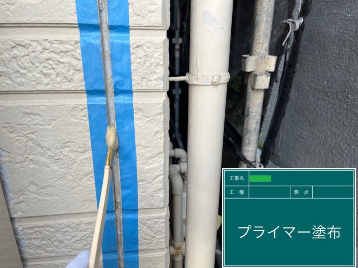 マスキングテープで養生した後、施工するシーリング材が剥離しないように丁寧にプライマーを塗りました。