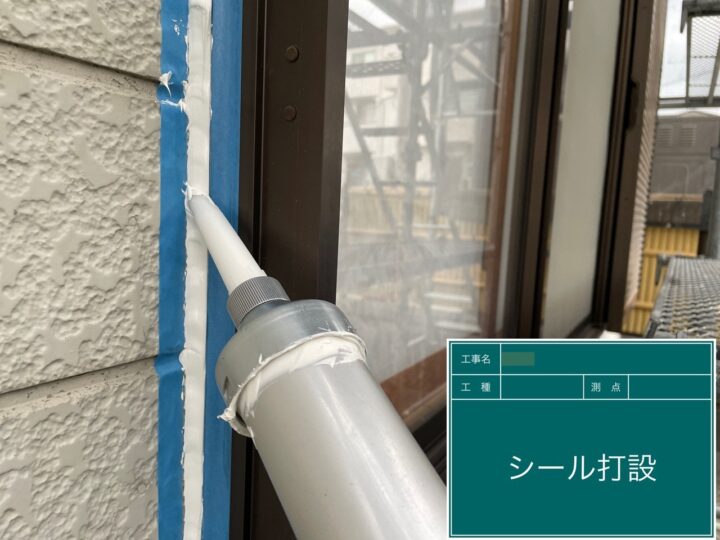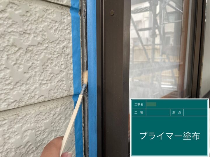 マスキングテープで養生した後、施工するシーリング材が剥離しないように丁寧にプライマーを塗りました。