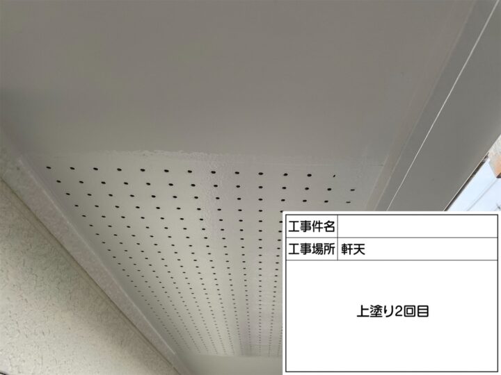 ケイ酸カルシウム板の軒天井は、防カビ性やヤニ止め効果の高い、高密着性NAD系艶消し塗料を2回塗で仕上げました。
