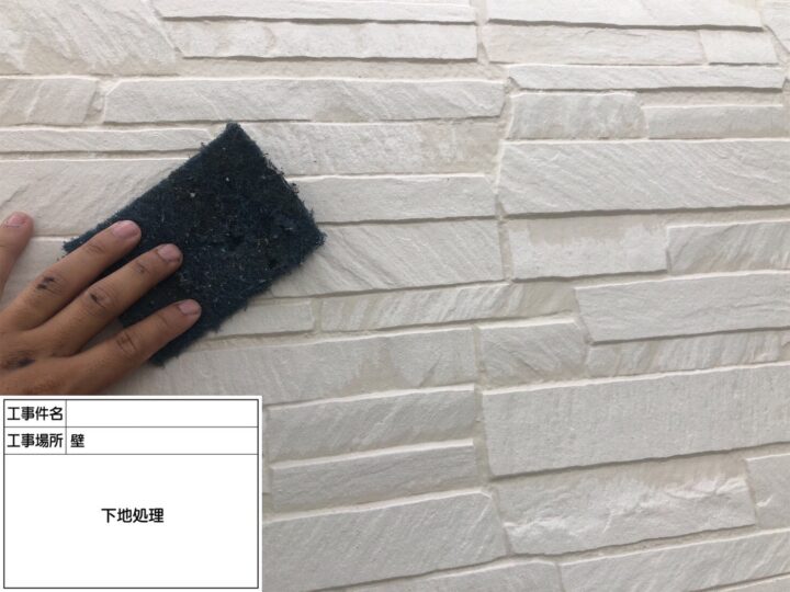 高圧洗浄である程度汚れを落としたあと、落としきれなかった汚れをペーパーケレンなどで落としていき、ひび割れなどのクラック補正しました。
