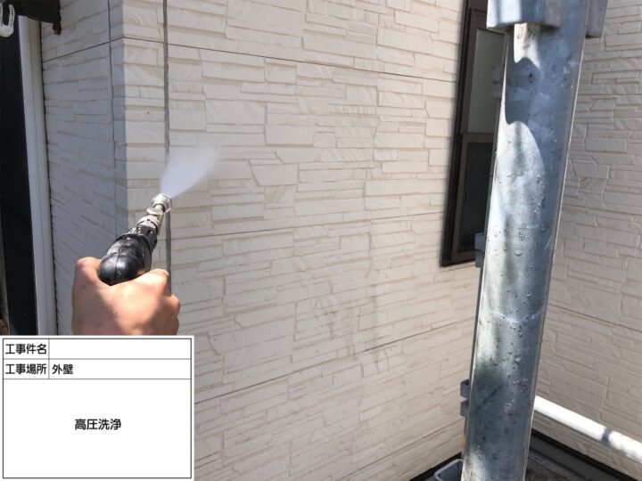 外壁に付着した汚れや埃等を、高圧洗浄で更に丁寧に落としていきました。