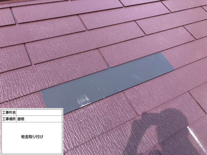屋根の剥落はいくつか見受けられ、雨漏りの原因に繋がってしまう為、下地処理として破損部を剥がし、板金のスレートを差し込み板金補修を致しました。