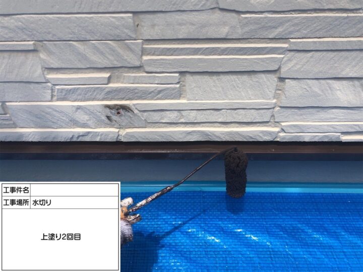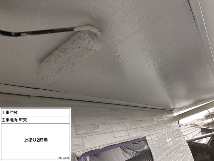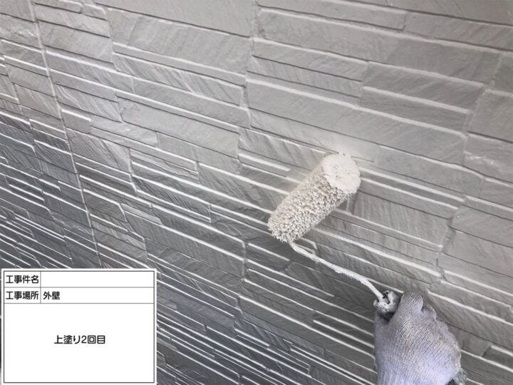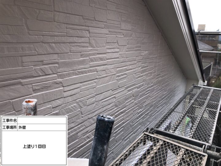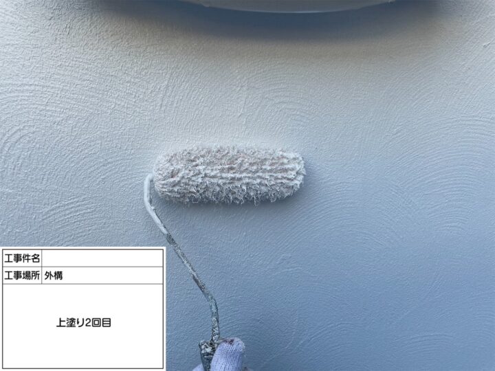 中塗り後、外壁最終仕上げの工程です。上塗りは塗膜厚の確保のために、ムラなく丁寧に塗装を行いました。