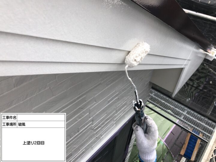 窯業系サイディングで出来た破風板・鼻隠し、こちらも下地処理し、プライマーを塗り、上塗りを2回全体へ塗装しました。