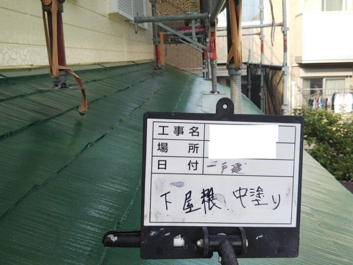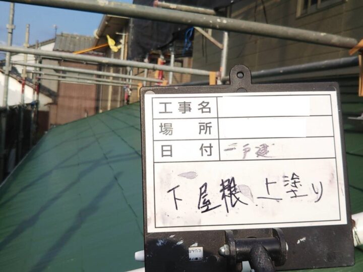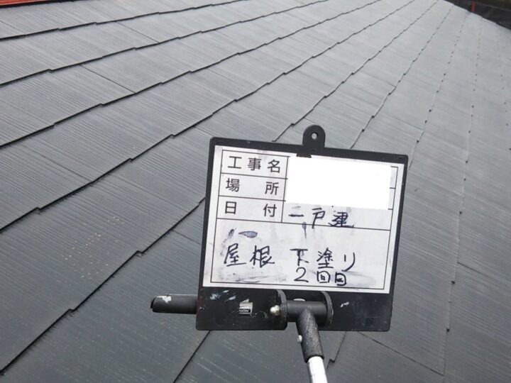 下塗り1回では、屋根材が下塗り材を吸い込んでしまい、密着させる役割が果たせなくなってしまったので、下塗りを2回行いました。