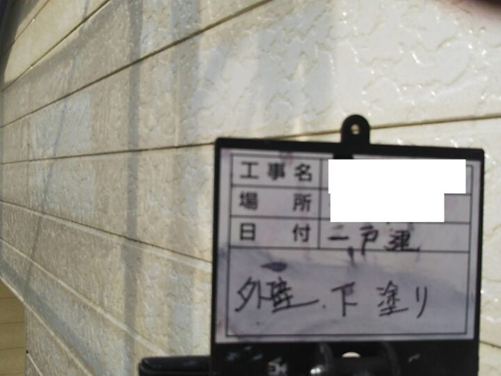 落としきれなかった汚れをペーパーケレンなどで落としていき、ひび割れなどのクラック補正したり、下地処理をした後、下塗りを行いました。