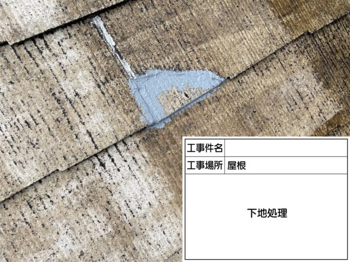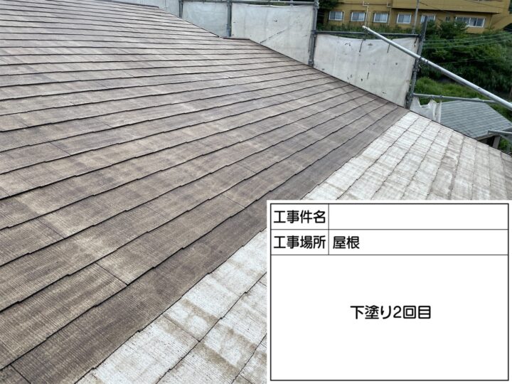 下塗り1回では、屋根材が下塗り材を吸い込んでしまい、密着させる役割が果たせなくなってしまったので、下塗りを2回行いました。