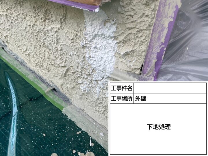 高圧洗浄である程度汚れを落としたあと、落としきれなかった汚れをペーパーケレンなどで落としていき、ひび割れなどのクラック補正したり下地処理を行いました。