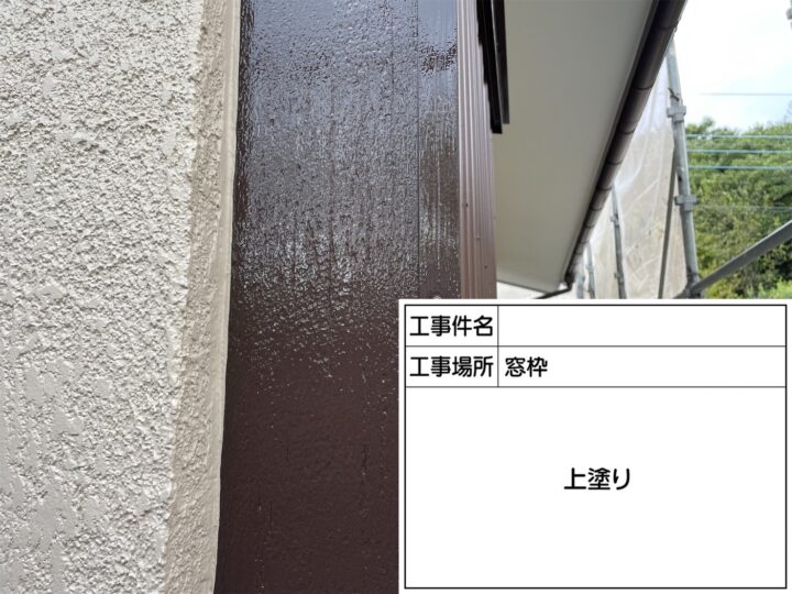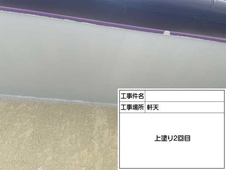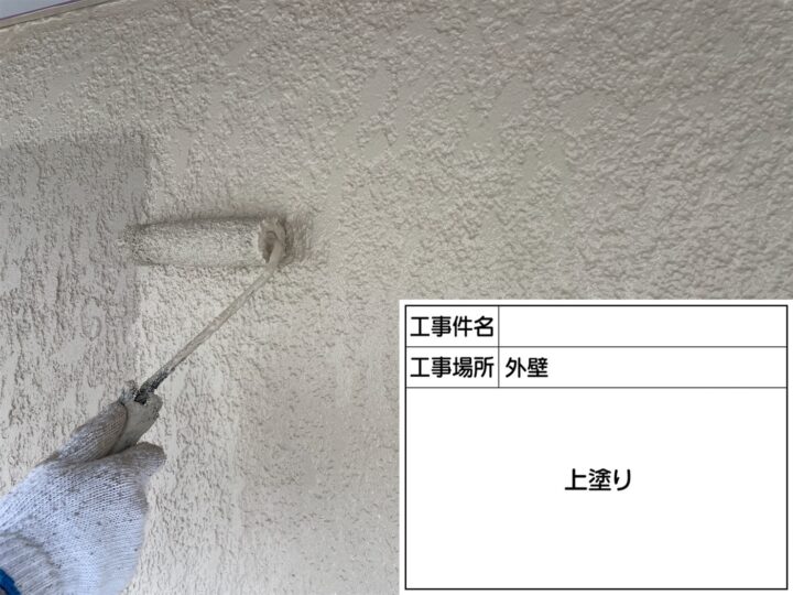 中塗り後、外壁最終仕上げの工程です。上塗りは塗膜厚の確保のために、ムラなく丁寧に塗装を行いました。