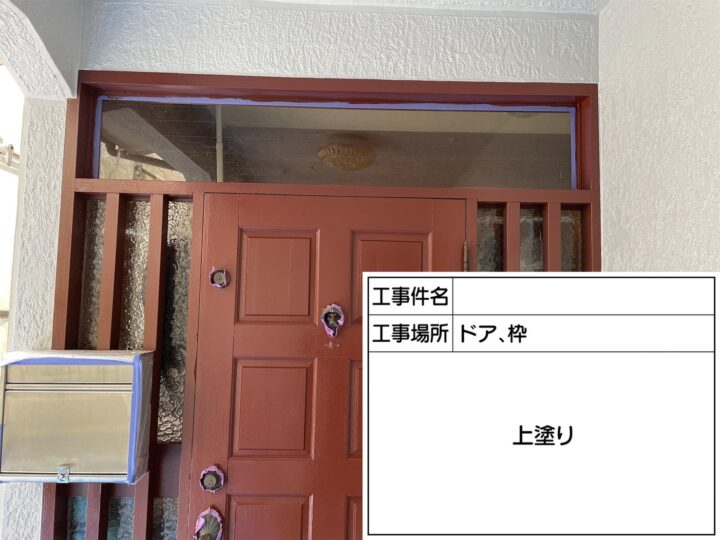 木で出来た玄関ドア・枠、しっかりと下地処理(ケレン)し、下塗りを塗り、上塗りを2回全体へ塗装しました。