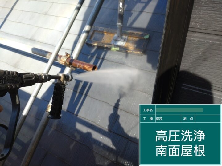 屋根には雨で降ってきたゴミや汚れ、湿気で繁殖したカビやコケなどが大量に付着しています。それらを落とし、きれいな状態にするために洗浄を行いました。