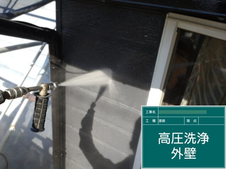 まずは洗浄を行いました。高圧洗浄を行うことで、こびりついた汚れもしっかり落とすことができ、きれいな塗膜を作るためにも塗装前にしっかり洗浄をいたしました。