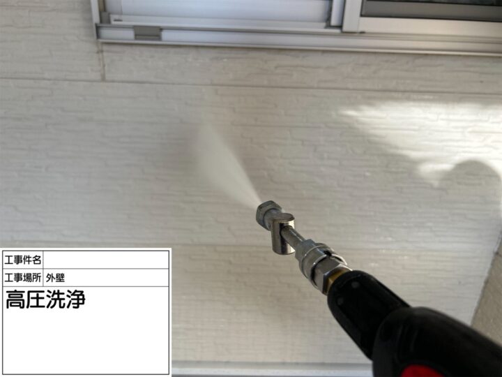 まずは洗浄を行いました。高圧洗浄を行うことで、こびりついた汚れもしっかり落とすことができ、きれいな塗膜を作るためにも塗装前にしっかり洗浄をしました。