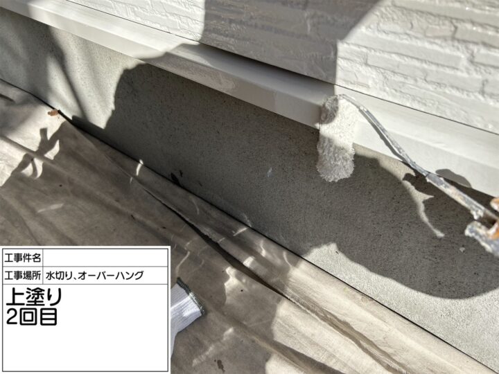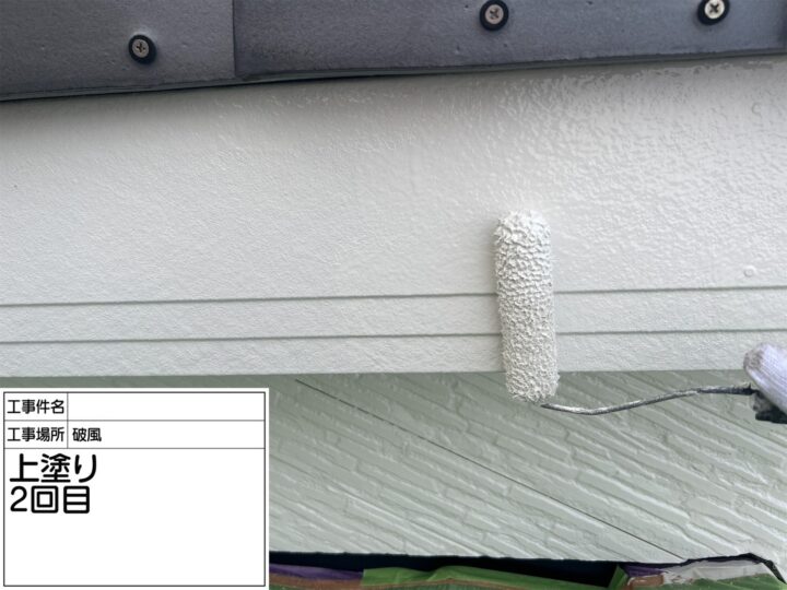 窯業系サイディングで出来た破風板・鼻隠し、こちらも下地処理し、プライマーを塗り、上塗りを2回全体へ塗装しました。