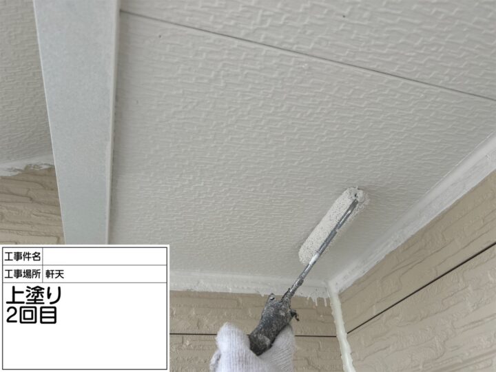 ケイ酸カルシウム板の軒天井は、防カビ性やヤニ止め効果の高い、高密着性NAD系艶消し塗料を2回塗で仕上げました。