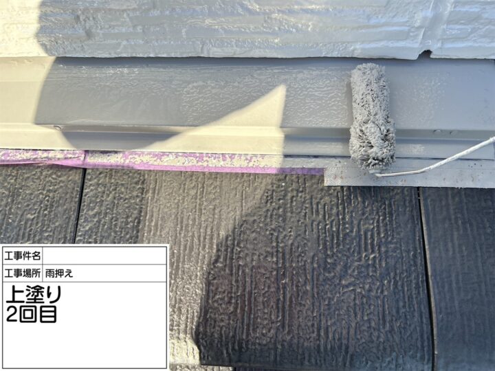 雨押えは、錆などは見受けられませんでしたが、色あせして美観を損ねていた為、目粗をして、錆止めを塗り、上塗り2回で仕上げました。