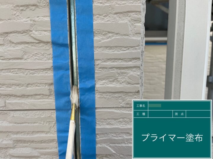 マスキングテープで養生した後、施工するシーリング材が剥離しないように丁寧にプライマーを塗りました。