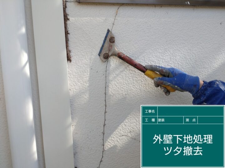 高圧洗浄である程度汚れを落としたあと、落としきれなかった汚れをペーパーケレンなどで落としていき、ツタの撤去などを行いました。