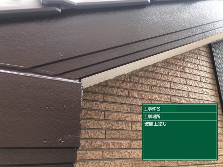窯業系サイディングで出来た破風板は、下地処理し、プライマーを塗り、上塗り2回全体へ塗装致しました。