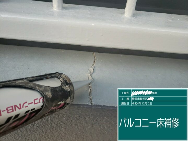 バルコニー床にもクラックが見受けられます。こちらは階下への雨漏りに繋がりますので、シーリングにて補修します。