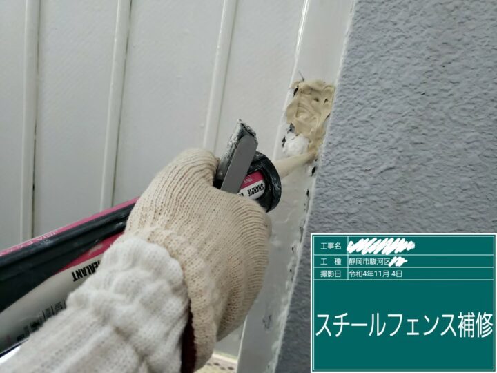 スチールフェンスにはサビの影響により、穴が空いています。内部に雨水等が入らないように、シーリングで補修します。