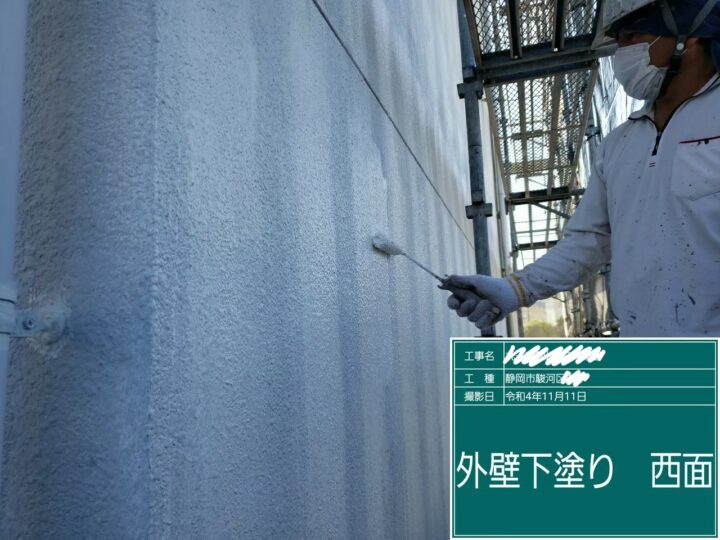 外壁の下塗りです。鉄筋コンクリートにはサーフェイサーを使用します。微弾性でクラックに追従性があり、防水効果の高い下塗り材です。