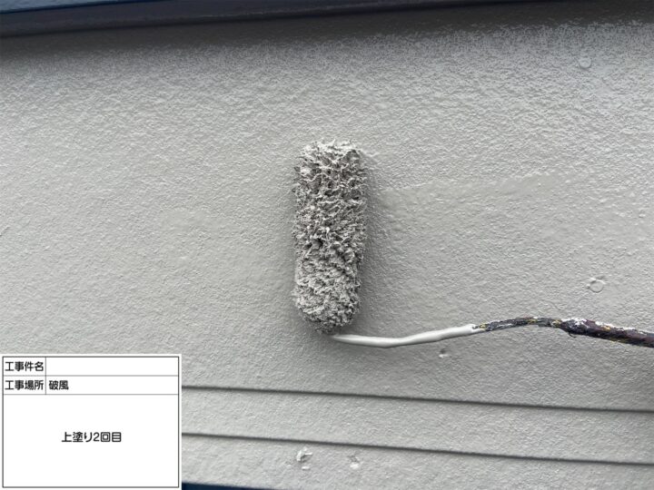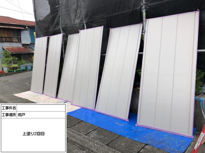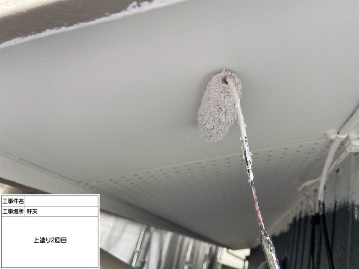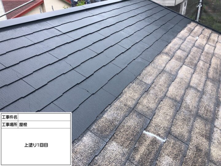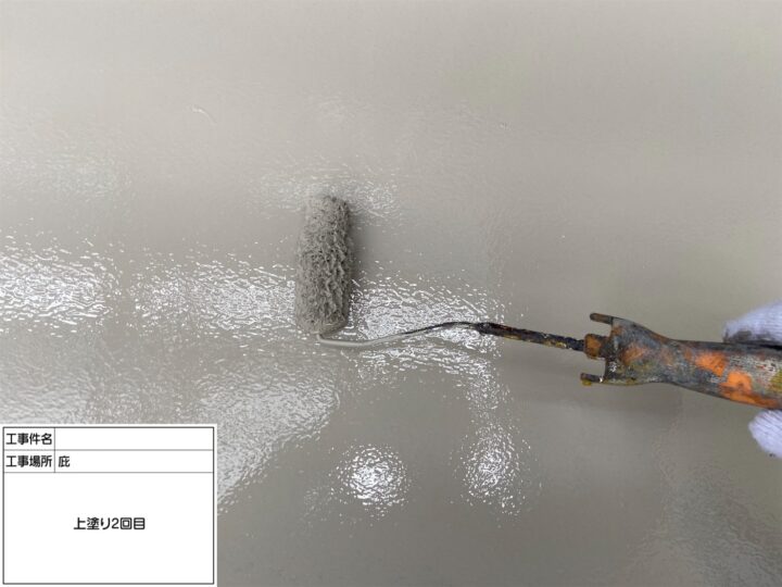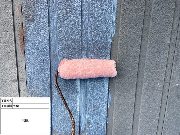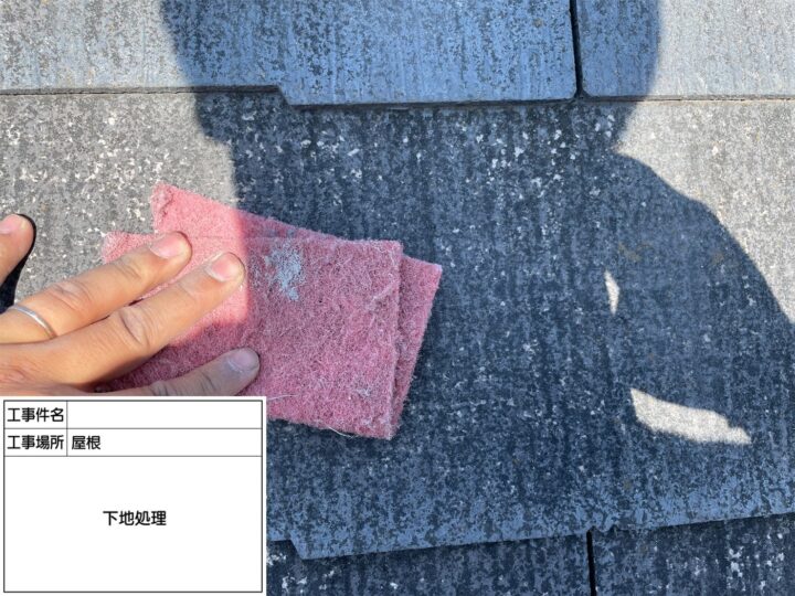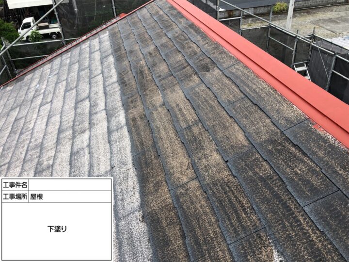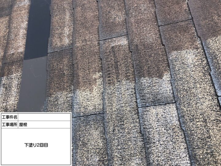 屋根の劣化が顕著だった為、中塗り・上塗り塗料の密着を高める為に下塗り2回塗布致しました。
