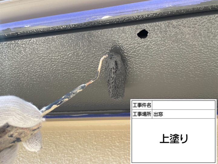 出窓上端・庇・帯・軒天は外壁同仕様の為、外壁同様に施工致しました。