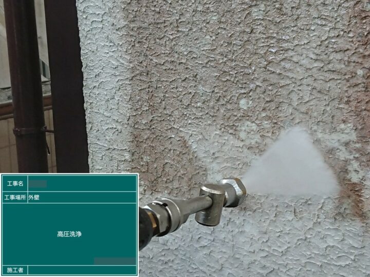 苔が多く見受けられた為、高圧洗浄の前に薬品洗浄を行いました。