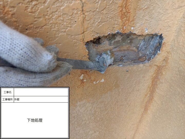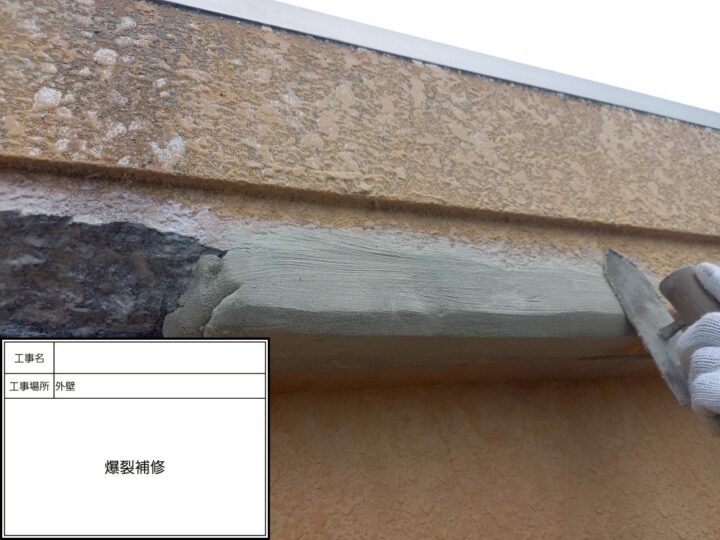 爆裂部は軽モル等で補修をし、外壁模様合わせを行った後、塗装させていただきました。